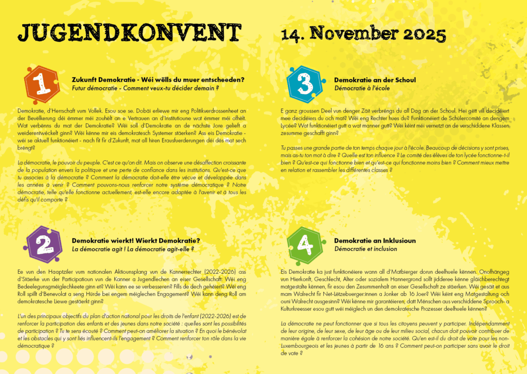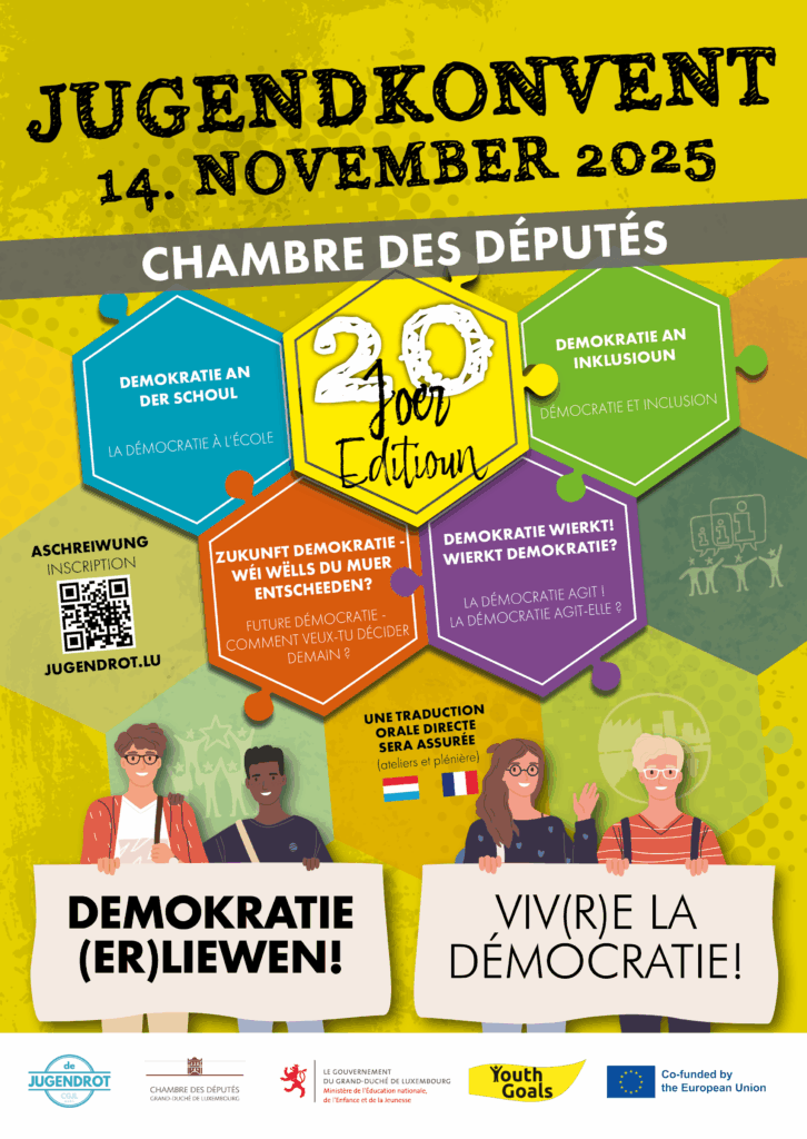 Tu as entre 13 et 30 ans et tu as envie d‘échanger tes idées sur des thèmes d’actualité avec les différents représentants politiques ? Alors rejoins-nous le 26 novembre à la Chambres des Députés pour discuter avec d’autres jeunes, des experts thématiques ainsi que nos représentants politiques sur la santé mentale, la crise du logement, l’école et l’emploi de demain et la durabilité. Quel impact la pandémie Covid 19 aura-t-elle sur tous ces domaines ? Viens et rejoins le débat !